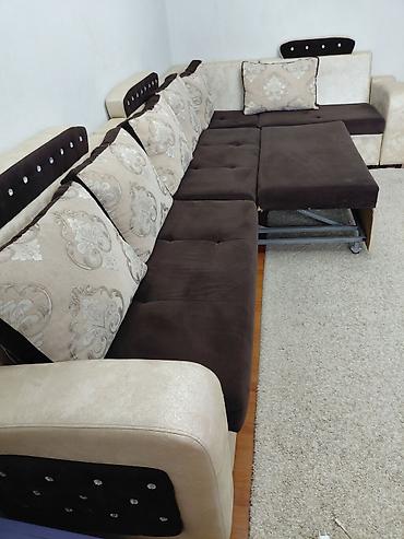 - Конфигурация: Г-образный, длинная сторона — много посадочных мест, широкая оттоманка. Центральная секция выдвигается на роликах, образуя ровное спальное место.