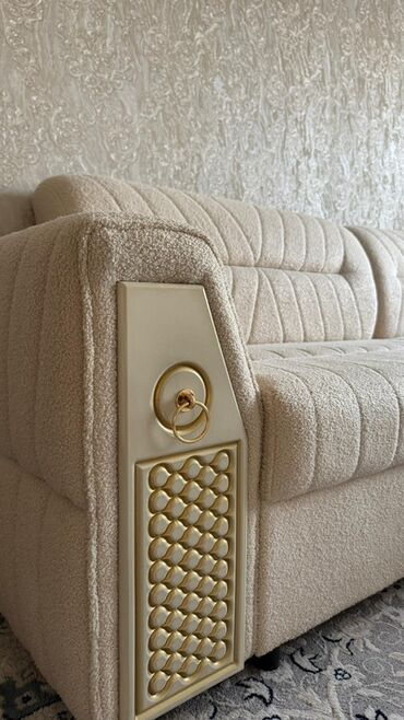 - Подлокотники с декоративными панелями в светлом золоте и фактурными вставками.