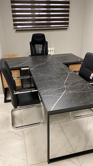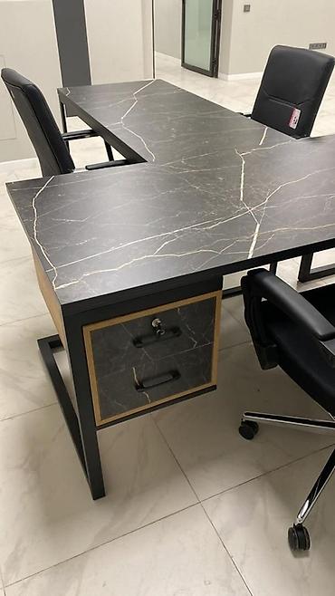 Угловой офисный стол с массивной столешницей под черный мрамор с белыми и золотистыми прожилками, установлен на металлическом основании. Столешница имеет L-образную форму, что обеспечивает просторное рабочее место. Встроенная тумба с тремя выдвижными ящиками и замком позволяет удобно хранить документы и канцелярские принадлежности. Прочная конструкция стола и стильный дизайн делают его подходящим для современного офиса или домашнего кабинета.