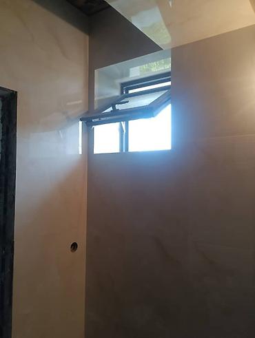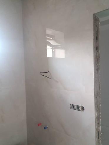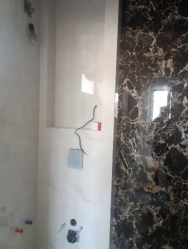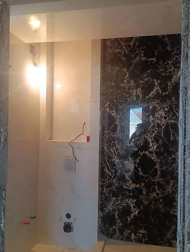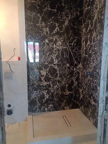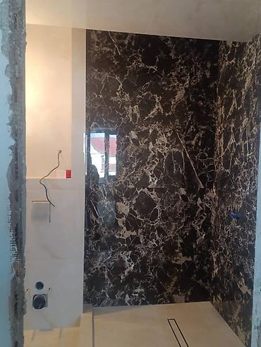 - Укладка крупноформатного керамогранита (светлый «мрамор» и контрастные тёмные плиты) на стены и пол, подрезка и стыковка с минимальными швами.