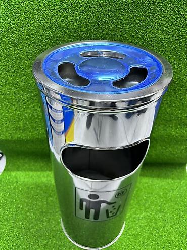 - Конструкция 2-в-1: верхняя часть — встроенная пепельница с круглыми прорезями для тушения и сброса окурков; основная часть — корзина для мусора.