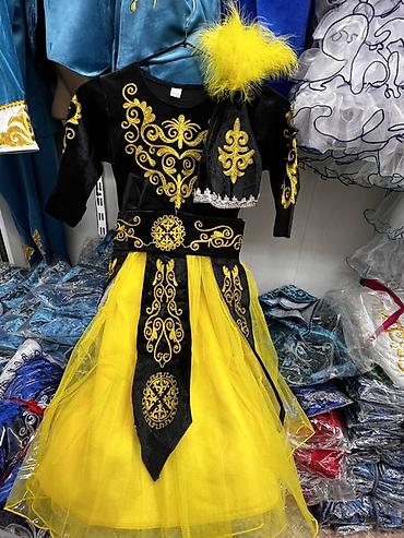 - Комплект: платье с пышным многослойным тюлевым подолом, пояс/декоративные полотнища, шапочка-таки с пером и бусинами.