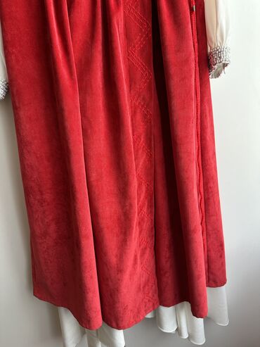Национальный женский комплект с вышивкой от Жанары Чынгышевой Состав: - Длинное светлое платье из лёгкой ткани с полупрозрачными рукавами и манжетами с золотистым кантом. - Бархатный жилет темно-...