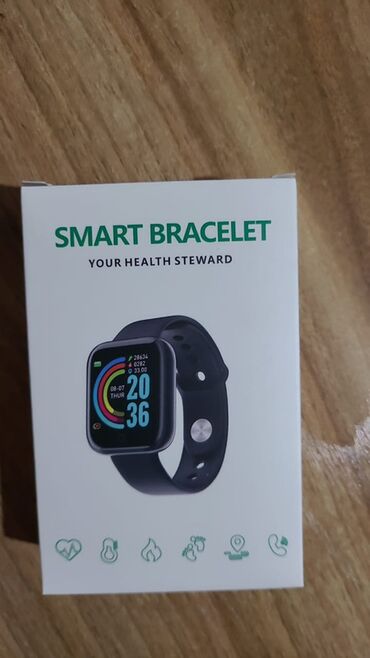 - На коробке указаны функции: мониторинг пульса, измерение температуры, подсчёт калорий, шагомер, отслеживание маршрута/геопозиции, уведомления о звонках