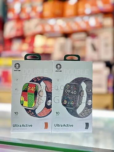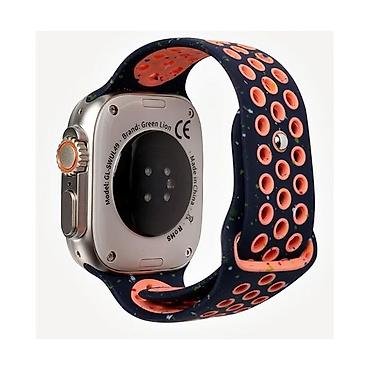 Умные часы Green Lion Ultra Active с прямоугольным корпусом серебристого цвета и синим ремешком. Ремешок имеет оранжевую внутреннюю поверхность и перфорацию для лучшей вентиляции. Часы оснащены поворотной кнопкой и дополнительной кнопкой сбоку. На задней панели расположены датчики и информация о модели: GL-SWUL49. Эти часы подходят для активного образа жизни и повседневного использования, обеспечивая удобный доступ к уведомлениям и функциям отслеживания активности.