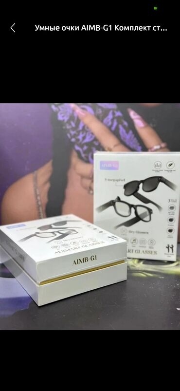 - Комплектация (по изображению коробки): очки AIMB‑G1, сменные линзы (солнцезащитные/прозрачные), зарядный кабель, документация/инструкция, фирменная коробка.