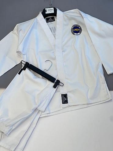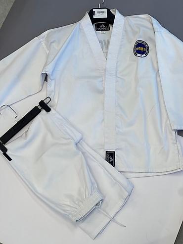 Белый костюм для тхэквондо от Adidas, состоящий из куртки и брюк. Куртка украшена эмблемой тхэквондо и логотипом Adidas. Брюки с эластичной резинкой на поясе обеспечивают удобную посадку. Подходит для тренировок и соревнований по тхэквондо.