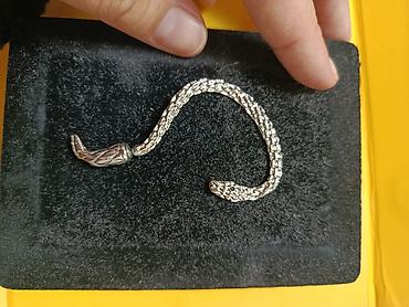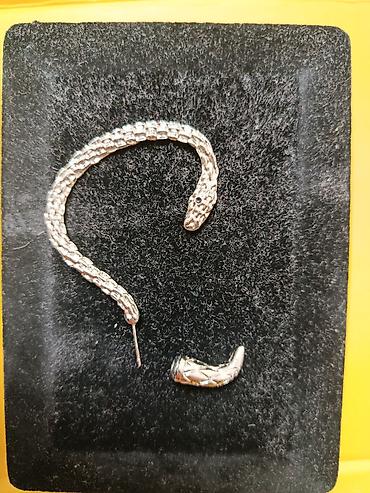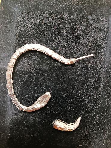 - Дизайн: объемная «чешуйчатая» текстура, голова змеи с тёмными глазками; второй конец оформлен как изогнутый хвост. Элементы соединяются между собой, образуя Серёжку.