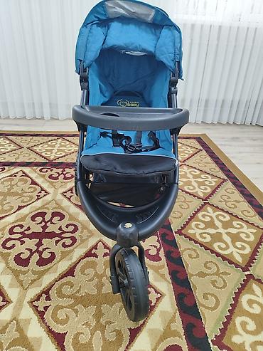 Универсальная детская коляска бирюзового цвета "My Baby" с устойчивой рамой и большими колесами для комфортного передвижения. Оборудована регулируемой ручкой, солнцезащитным козырьком с прозрачным окошком и пятиточечными ремнями безопасности. Имеет съемный бампер-столик и вместительную корзину для покупок под сиденьем. Переднее поворотное колесо обеспечивает маневренность. Подходит для ежедневных прогулок.