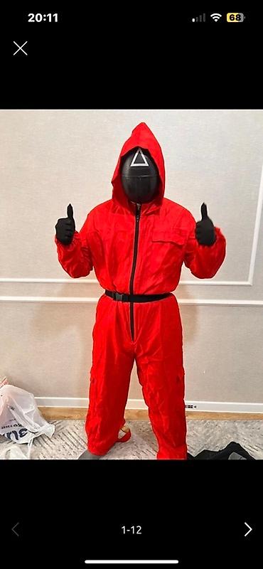 - Красный комбинезон с капюшоном, молнией по центру и нагрудным карманом на молнии.