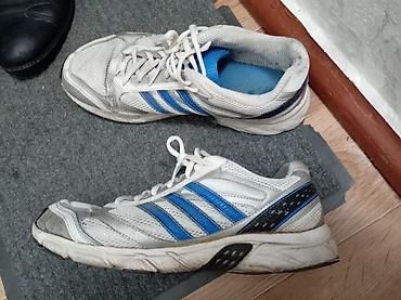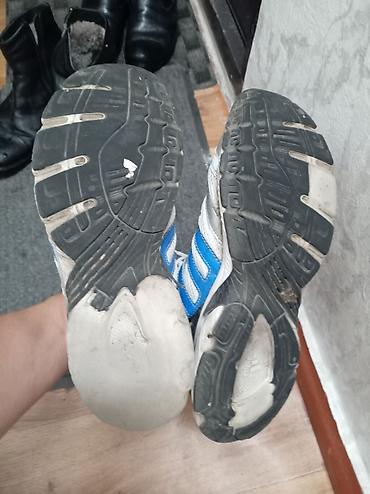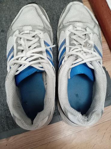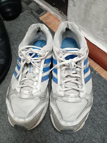 Кроссовки б/у для бега/фитнеса, бело‑серые с синими деталями и тремя боковыми полосками. Дышащий верх из сетки, шнуровка классическая. Внутри мягкая голубая стелька, язычок из сетчатого материала. Подошва резиновая с выраженным протектором и гибкими канавками, усиленные зоны на носке и пятке. Низкий профиль, амортизирующая промежуточная часть, вентиляционные вставки по бокам. Универсальны для тренировок, ходьбы и повседневного использования. Размер визуально ближе к мужскому среднему (уточняйте по стельке/замерам). Цвет: белый/серый/синий.