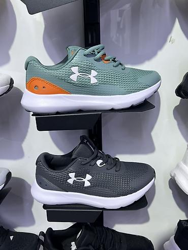 - Under Armour: легкие кроссовки с сетчатым верхом и логотипом на боковой части. Комфортный воротник, шнуровка, мягкая пена в мидсоли для амортизации, гибкая резиновая подошва. Цветовые решения: серо-зеленые с оранжевым акцентом и белой подошвой; тёмно-серые с белыми элементами.