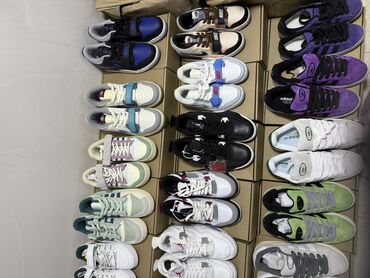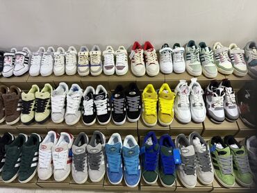 - Размеры и варианты колодки: представлены мужские и унисекс-модели, широкий выбор размеров (видно много пар одного дизайна в разных размерах).