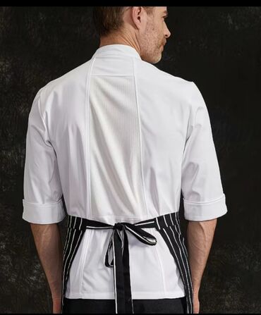Белый поварской китель с рукавами 3/4 и воротником-стойкой. Имеет диагональную застежку на кнопках и сетчатую вставку на спине для улучшения вентиляции. Подходит для профессиональной кухни и повсед...