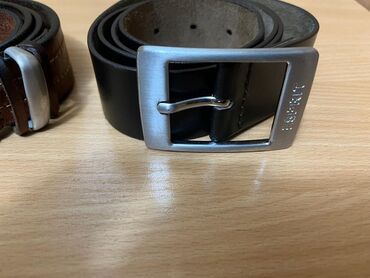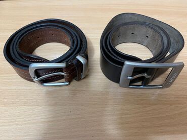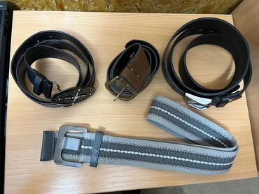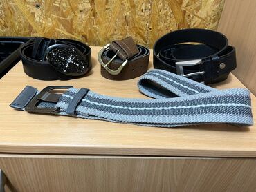 - Несколько дополнительных ремней на выбор (см. фото): черные и коричневые варианты с различными пряжками, а также серо‑светло‑серый плетеный ремень с декоративными полосами и широкой пряжкой.