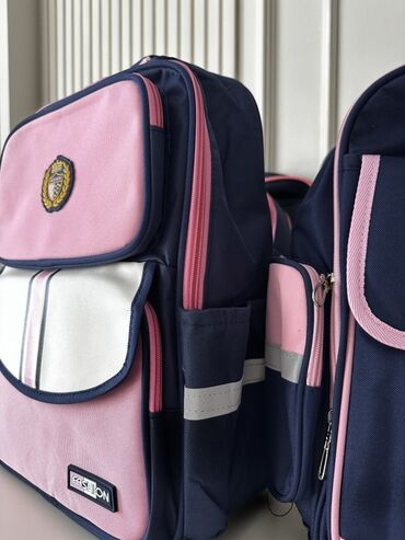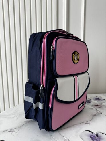 Представляем школьный рюкзак, выполненный в розовом, белом и темно-синем цветах.