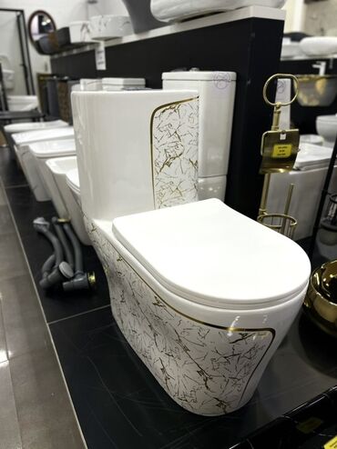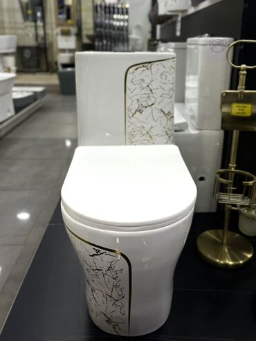 Унитаз из керамики с белой глянцевой поверхностью, украшенный золотистым узором, имитирующим мрамор или трещины. Он оснащен бачком и сиденьем с крышкой. Этот унитаз подходит для использования в современных интерьерах ванных комнат, добавляя элемент роскоши и изысканности. Благодаря своему дизайну, он может стать центральным элементом декора.