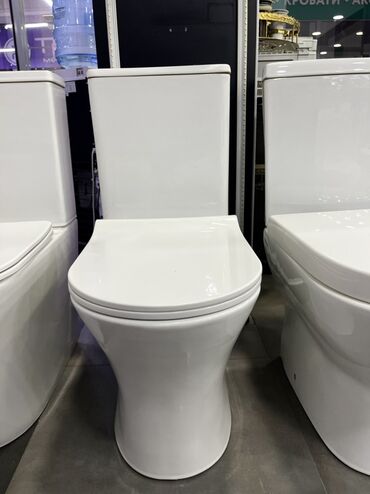 Белый унитаз-компакт современного дизайна с напольным типом установки. Обладает гладкой поверхностью, что облегчает уход за ним. Оснащен бачком, расположенным сзади, и сиденьем с крышкой. Подходит для установки в ванных комнатах и санузлах, обеспечивая базовую функциональность.