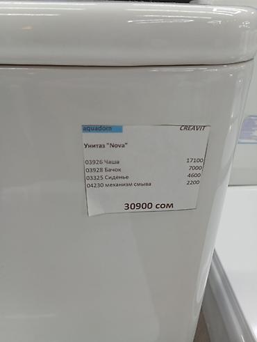 - На стенде указана цена: 30900 сом (чаша 17100, бачок 7000, сиденье 4600, механизм слива 2200)