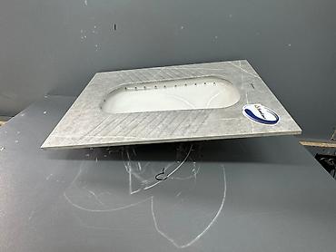 Керамический напольный чаша Генуя SanLine, предназначенная для установки в общественных санузлах. Конструкция выполнена в белом цвете и установлена на серую мраморную платформу. Чаша имеет отверстия для слива и обеспечивает гигиеничное использование.