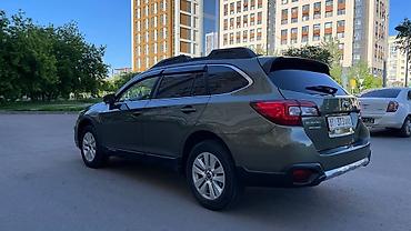 Subaru Outback, универсал-кроссовер в зелёном цвете (металлик). Полный привод Symmetrical AWD, высокий клиренс, фирменные рейлинги на крыше с перекидными поперчинами. Светодиодные ходовые огни, противотуманные фары, легкосплавные диски, тонированные стекла, камера заднего вида (виден объектив под эмблемой). Задний спойлер, защитный обвес, хром-накладка на бампере.