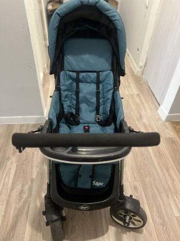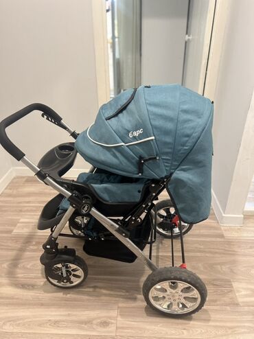 Универсальная детская коляска «Барс» бирюзового цвета, оснащенная четырьмя колесами, включая два поворотных передних колеса для легкого маневрирования. Оборудована регулируемым капюшоном, который защищает ребенка от солнца и ветра. В комплект входит корзина для покупок под сиденьем и подстаканник на ручке для удобства родителей. Коляска легко складывается, что делает ее идеальной для транспортировки и хранения.