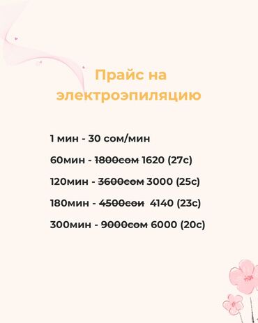 Шугаринг и восковая эпиляция — прайс: Лицо: - Усы — 100 сом - Баки — 200 сом - Шея — 200 сом Тело: - Руки — 400 сом - Подмышки — 200 сом - Спина — 300 сом - Ноги — 450 сом Зона бикини: - Бикини ...