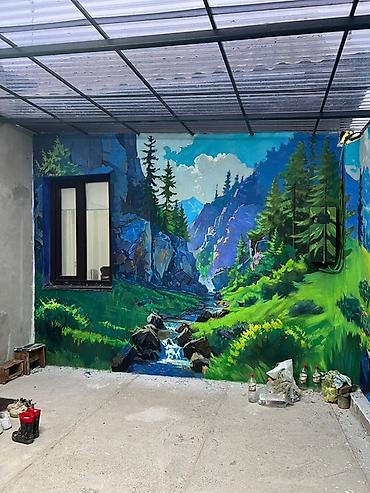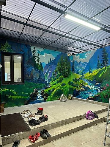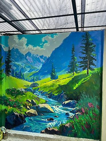 - Настенная роспись с эффектом «прозрачного окна» в природу: горы, хвойный лес, ручей, скалы и луговые цветы. Панорама переходит с одной стены на другую, создавая глубокую перспективу и ощущение пространства.