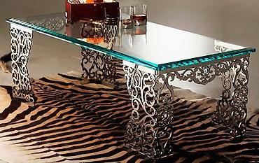 Пример применения на фото: изящные металлические ножки стола с ажурным рисунком, созданные методом лазерной резки, с последующей полировкой/обработкой.
