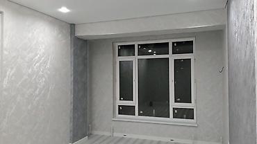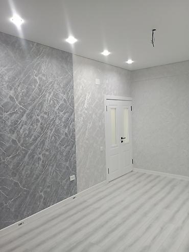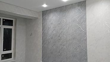 - Отделка стен: декоративная штукатурка и обои с текстурой камня/мрамора, ровные углы и аккуратные откосы.
