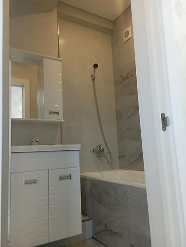 - Ванная: облицовка керамогранитом серых оттенков; ванна стандартная; смеситель с душем; подвесной шкаф с умывальником и зеркальным модулем; вытяжка.