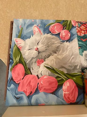 - Пример результата на фото: картина по номерам с котёнком и тюльпанами — плотная заливка цвета, чистые переходы, без просветов.