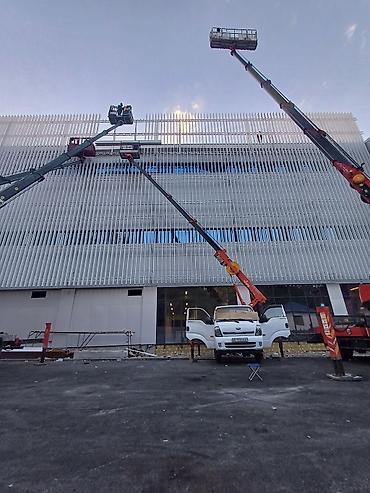 Монтаж фасадов и облицовки высотных зданий с использованием автовышек - Профессиональные фасадные работы на высоте: установка вертикальных ламелей/жалюзи, композитных и металлических панелей, витр...