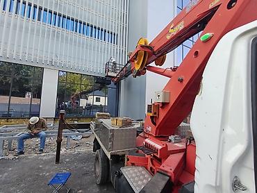 - Компактная колёсная автовышка на базе малотоннажного грузовика — удобна для работы в стеснённых условиях дворов и строительных площадок.