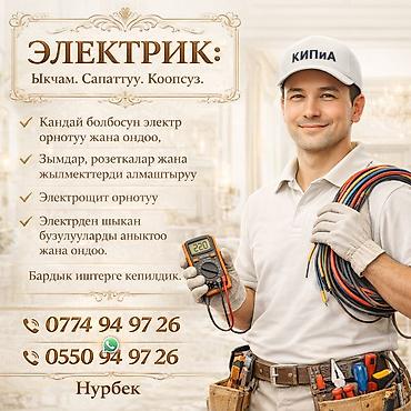 Электрик Бишкек Электромонтажные и ремонтные работы - Экстренный выезд и оперативное выполнение задач - Работаем в любое время суток - Гарантируем качество выполненных работ Перечень услуг: - Диа...