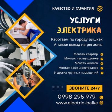 Услуги электрика — Бишкек Профессиональные работы: - Ремонт освещения - Ремонт и модернизация электропроводки - Проверки электробезопасности Звоните 24/4 Phone Number:
