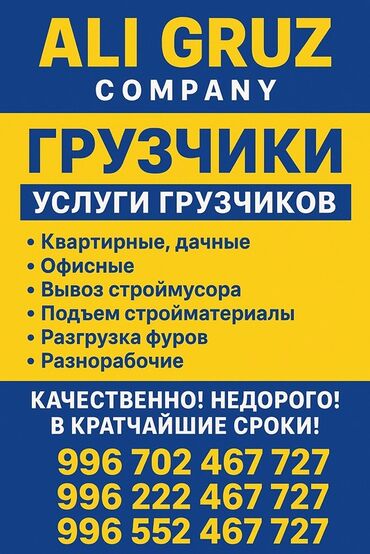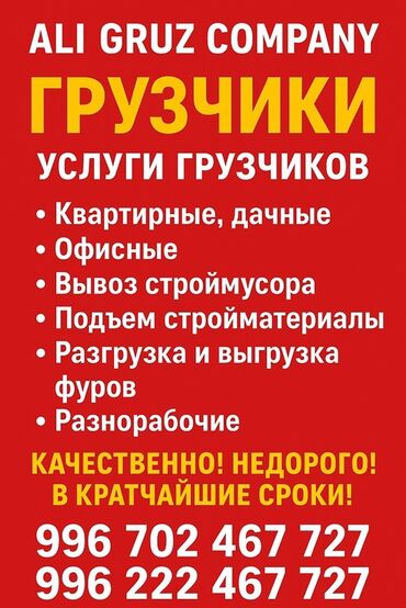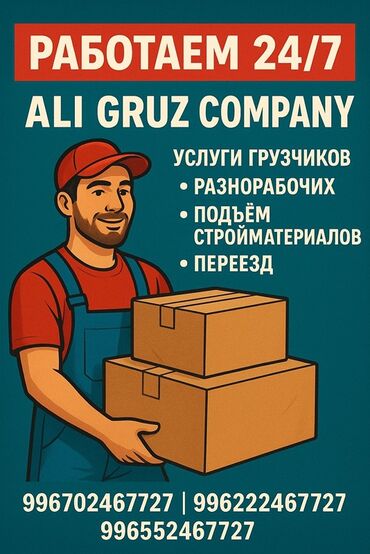 ALI GRUZ COMPANY — услуги грузчиков и разнорабочих. Что предлагаем: - Квартирные и дачные переезды - Офисные работы - Подъём стройматериалов - Разгрузка и выгрузка фур - Вывоз строймусора - Разнор...