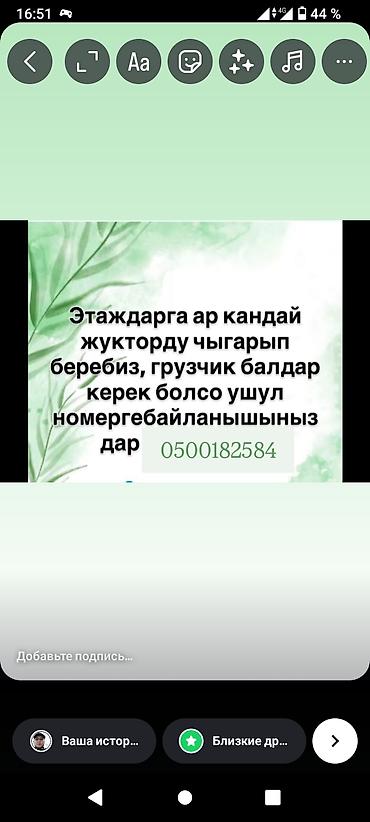 Кызмат: Грузчики/грузовые машины Переезд кызматтары 🏠Батир жана офис кочуруу 🏡дача жана курулуш материалдардын Жеткируу 🚛Жук жуктоо, тушуруу 🗑️ Мусор чыгаруу 🪘Жыгач жана эмерек чогултуу жана ...