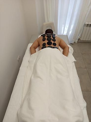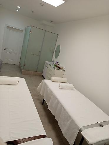 Кабинет с двумя удобными массажными столами, душевой зоной, текстилем и принадлежностями для процедур. Атмосфера тишины и чистоты, аккуратные рабочие места, используются масла и камни для стоун-терапии. Возможны индивидуальные и парные сеансы.