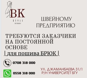 Требуется Заказчик Швейный Цех Платья и Пиджаки, Пальто, Спортивка, Куртки Посадка Идеально, Качество И Количество+Лекала Срок Ответственост Гарант 30-Машинки Есть Все Спец Оборудование! Шъем на Ва...