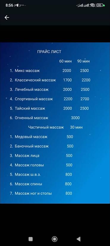 1 саат массаж 2000 сом общий двухсторонний Классический 2000 Лечебный 2000 Баночный 2000 Медовый 2000 Вакумный 2000 Спортивный 2000 Выезд 1 час 4000 ✅Адрес Логвиненко 37 Б