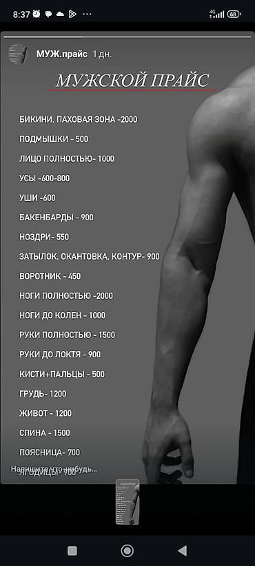 Мужской шугаринг — депиляция сахарной пастой для различных зон тела. Перечень услуг и цены на изображении: - Ноги полностью — 1500c - Руки полностью — 1200c - Подмышки — 300c - Паховая зона (класс...