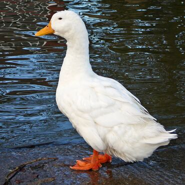 - Классические признаки: полностью белое оперение, оранжевый клюв и лапы, крепкие крылья, ровная спина.