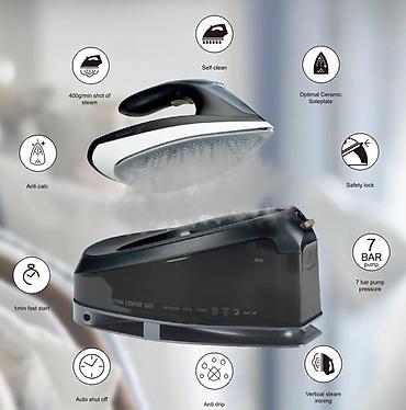 парогенератор поддержание оптимальной температуры подошвы. Можно гладить любые ткани без риска испортить материал. Время подготовки к работе: 30 секунд. Электронное управление на ручке. Керамическое покрытие подошвы - PRO 5 Ceramic. Давление пара до 7 бар. Объем бака 1.5 л. Антикапельная система. Долив воды во время глажки. Автоотключение при отсутствии воды. Отключение при перегреве. Автоотключение после 10 минут в режиме ожидания. Режимы работы: сухое глажение; "паровой удар" до 400 г/мин; мощность постоянного пара до 120 г/мин; вертикальное отпаривание; ECO-режим (до 60 г/мин).