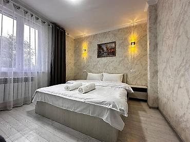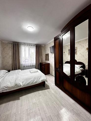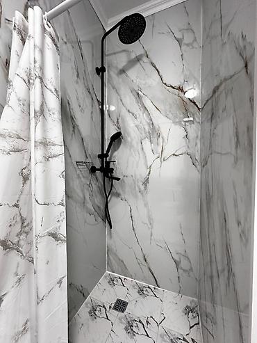 Уютная и светлая комната с современным интерьером, предназначенная для комфортного проживания.В комнате есть двуспальная кровать с чистым постельным бельем и полотенцами, прикроватные тумбочки и настенные светильники для дополнительного освещения...Для хранения вещей предусмотрен вместительный шкаф с зеркальными дверцами и открытыми полками. Также имеется комод и телевизор на стене. Окно с плотными шторами обеспечивает приватность. Ванная комната оборудована современным душем с черной лейкой и имитацией мрамора на стенах и полу, что придает ей стильный вид. Идеально подходит для краткосрочного или долгосрочного проживания..