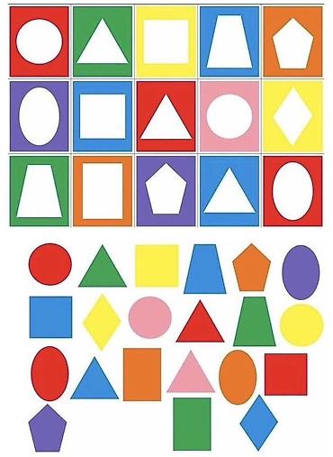 - Комплекты двусторонних карточек с геометрическими фигурами и цветами: круг, квадрат, треугольник, прямоугольник, овал, ромб, трапеция, пятиугольник, звезда, сердце и др. Яркие вынимаемые фигуры для сортировки и сопоставления с рамками.
