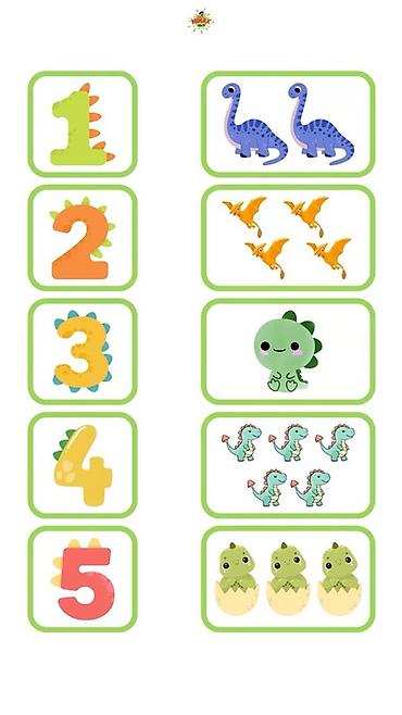 - Серия карточек по счету от 1 до 5 с иллюстрациями динозавров: цифра и соответствующее количество персонажей для наглядного освоения количества и соответствий.