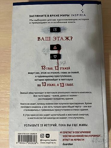 Аннотация с обложки: 13 глав, 13 этажей ведут к чудовищному преступлению, которое произойдет в пентхаусе на 13‑м этаже, в 13‑й главе. Званый обед проходит в пентхаусе роскошного жилого комплекса. Все гости — чужие, даже хозяин — миллиардер и владелец здания. У приглашенных нет ничего общего, кроме почтового индекса и тревожных встреч в стенах дома. К утру один из них умрет мучительной смертью — и никто никогда не узнает, что случилось. Услышьте 13 историй, пока вы еще живы.