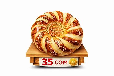 Свежеиспеченный узбекский хлеб круглой формы, украшенный характерными узорами и посыпанный семенами кунжута. Хлеб имеет румяную корочку и мягкую середину. Идеально подходит для повседневного стола ...
