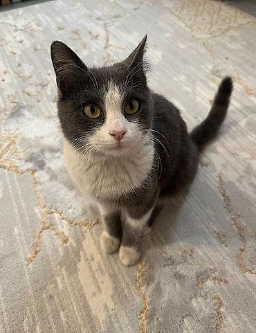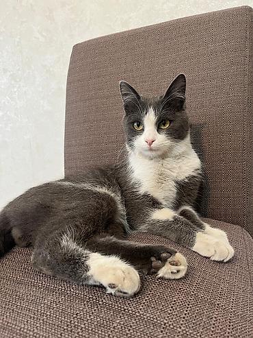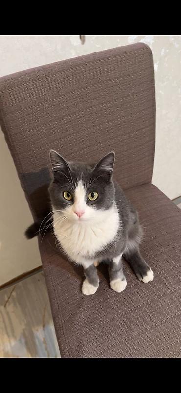 Кот домашний, короткошёрстный, окраса биколор: серо-белый. Плотная плюшевая шерсть, крупные круглые глаза янтарного оттенка, компактное телосложение с мощными лапами и широкими щёчками. Спокойный т...
